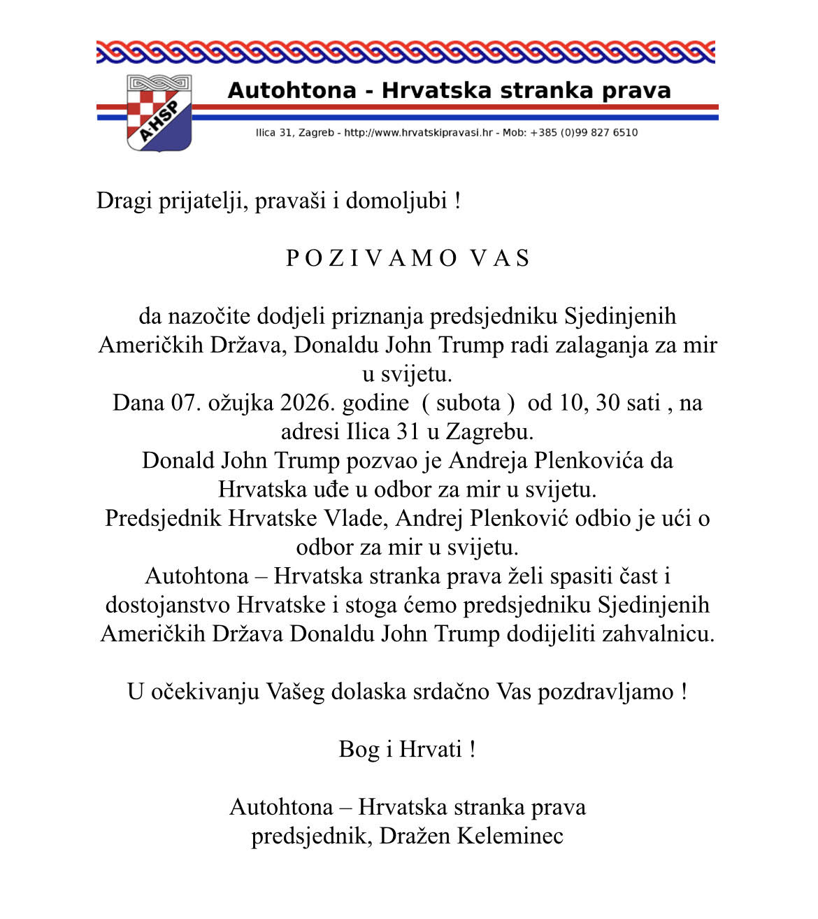 da nazočite dodjeli priznanja predsjedniku Sjedinjenih Američkih Država, Donaldu John Trump radi zalaganja za mir u svijetu.